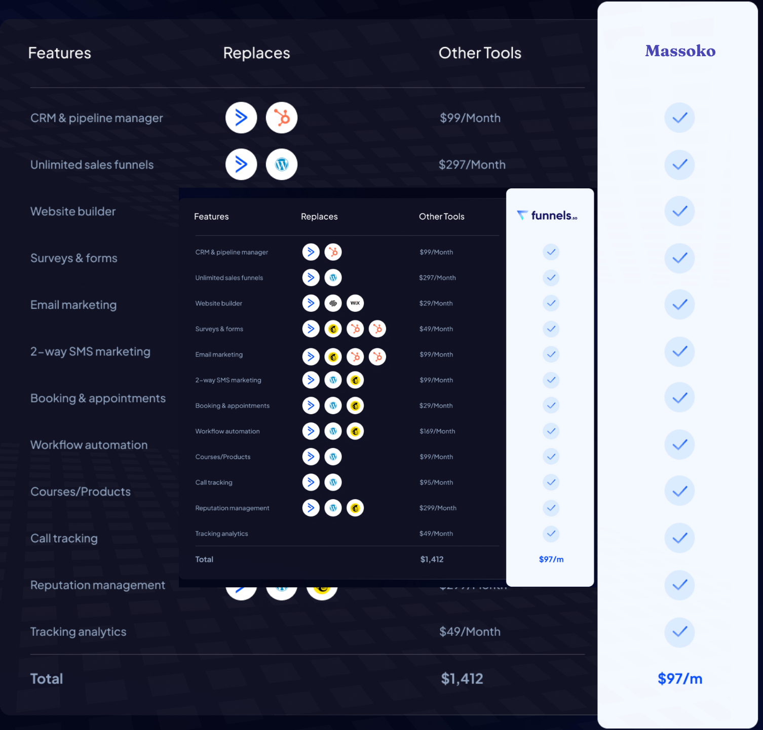 The Massoko Platform is everything that marketers need to manage their leads, websites, funnels, calendars and many other services that are needed to maintain a customer.